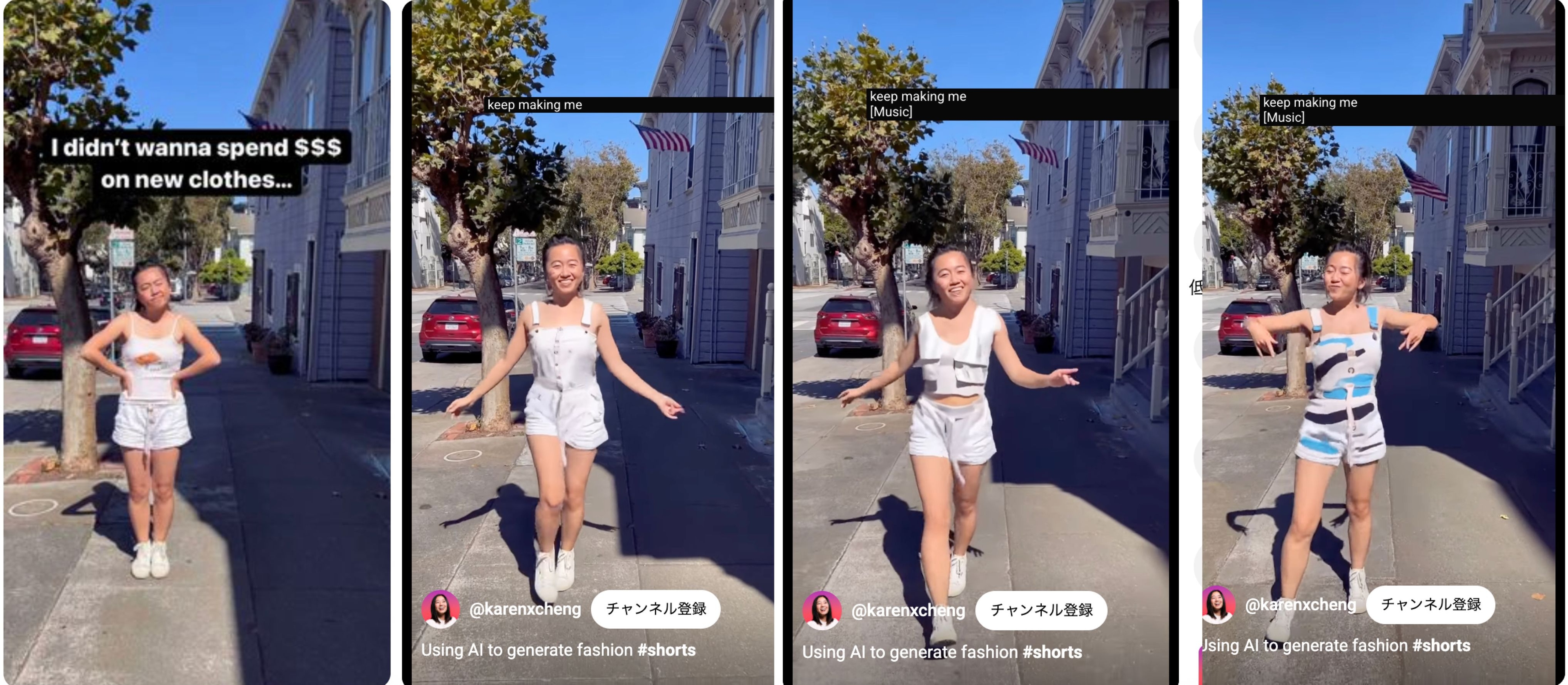 これはまずDALL·E 2を使って新しい服を生成し、動画に使う好きな服の画像を選びます。しかしDALL·Eは静止画専用。動画としてスムーズにつなぐ機能はありません。そこで、本来は絵画タッチの映像に変換するツールですが、EBSynth(*AIツールではない)を使って服のデザインを反映していくと、、、ほんのちょっと違和感はありつつもかなり自然になりました。最後にDainを使ってぬるっとしたスムーズさを出して完成!